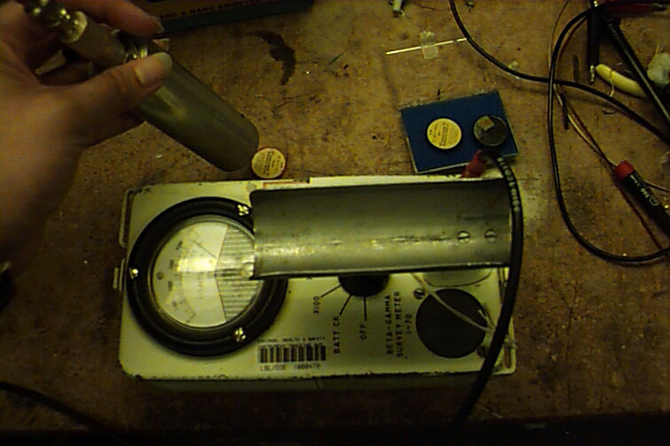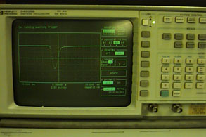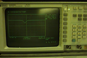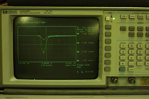 Circuit Board DesignEach scintilator is connected to one phototube which is wired to the analog input of the circuit board. When any cosmic ray hits the scintillator and electrons are being reflected. These electrons are then being processed as signals by the board and is then transformed into three kinds of outputs for observations. There is a counting device on the circuit board. The counts are shown on the board through a three-digit display. There is also a beeper which signals each count. Data of observation can also be observed through a TITMCBL SystemTM which is also connected to the circuit board. Another important feature of this design is that cosimc rays detection can be observed on only one of the phototubes or the coincidence of both phototubes. The phototubes are powered by the board which in turn is powered by a power supply. The power supply could simply be batteries, or an AC adaptor, or even a car-lightor adaptor. I also conducted a little test to see if the scintillator works. You may click here to see the data of the test. As you can see from the data, the phototube is very sensitive to the radioactive materials when placed on the scintillator. As the radioactive source gets close to the tube, the potential difference is significantly bigger. What does this mean? It means the scintillator works, otherwise the phototube could not have been so sensitive to the radioactive source. These are some graphic examples of the oscilloscope display. The first one is when there is no radioactive source placed on the scintillator. The second picture is when there is a radioactive source placed on the scintillator. The third is just a display of all results. The fourth one is just the setup for the test.